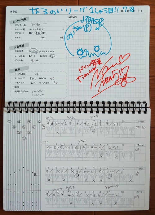 アイキョウボウルで、月1で行われる「なるのいリーグ」に参加しています。